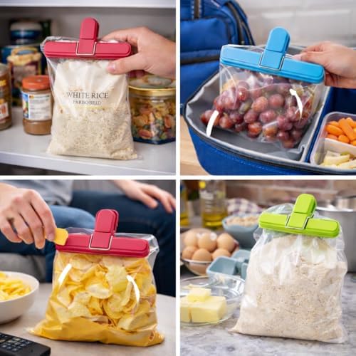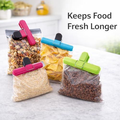 About this item Food Bag Clips for Food Storage – Set of 9 reusable food clips in 3 colours (rose red, light green and blue), with 3 clips per colour. Designed as practical food clips for bag sealing for everyday kitchen and home use. Each clip measures approx. 7.5 cm (2.9 inches). Sturdy & Durable Bag Clips – These bag clips for food storage are made from durable ABS material with a stainless steel spring, offering a reliable grip for sealing food bags without bending or breaking over time. Suitable for Freezer Bags – Can be used as freezer bag clips to help keep freezer bags securely closed, reducing air exposure and supporting organised food storage in the freezer or refrigerator. Multipurpose Clips for Sealing Bags – Ideal for sealing bread bags, snack packets, coffee bags and pet food storage bags. These multipurpose food clips are suitable for use in the kitchen, office, garage or shed. Easy to Use & Reusable – Kitchen clips feature a non-slip grip design, making them easy to open and close. Reusable and practical for daily use, helping keep opened bags neatly sealed and organised.