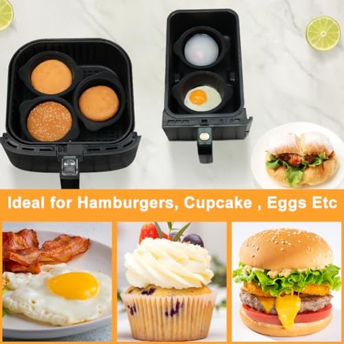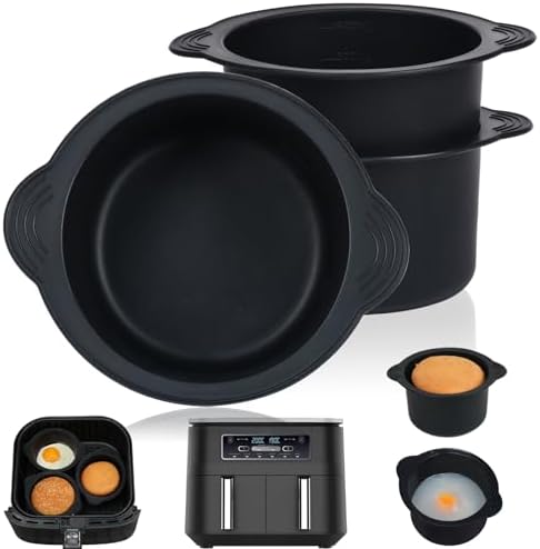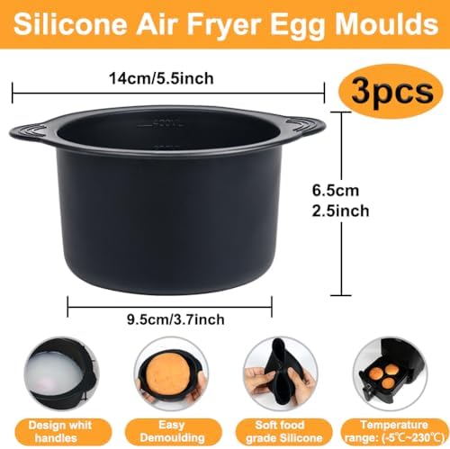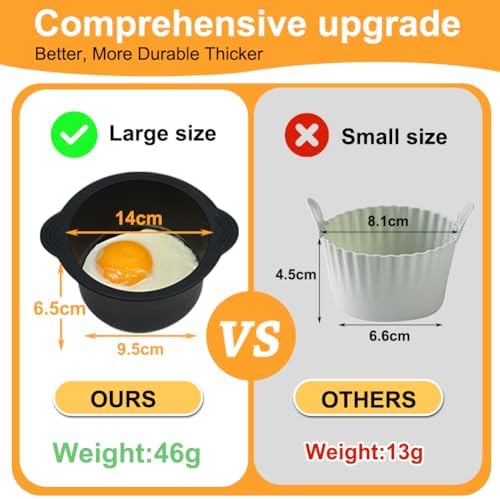 About this item Ramekins for Air Fryer – The air fryer egg moulds measure bottom is 9.5cm,Top:14cm, Height: 6.5cm. They are compatible with all air fryers(such as fit for Ninja/Tower/Cosori/Tefal air fryer) Easy to Clean & Dishwasher Safe – Our air fryer egg poachers are soft and flexible, you just need to flip it inside out and wash it with warm water. It’s also dishwasher safe, avoiding the trouble of hand washing Reusable and Save Money – Our black muffin cases made of safe food-grade silicone, can withstand the temperature up to 446 ℉ (230℃) , not easy to deform or tear, which can be applied for a long time, no need to worry about burning Widely Used – Black Cupcake Cases suitable for making muffins, cupcakes, poached eggs, and more How to make the perfect poached egg?- 1、Pour in enough boiling water (must be can submerge the eggs) 2、Slowly slide in the eggs 3、Poach at 180°C for 8 minutes 4、Gently spoon along the edges